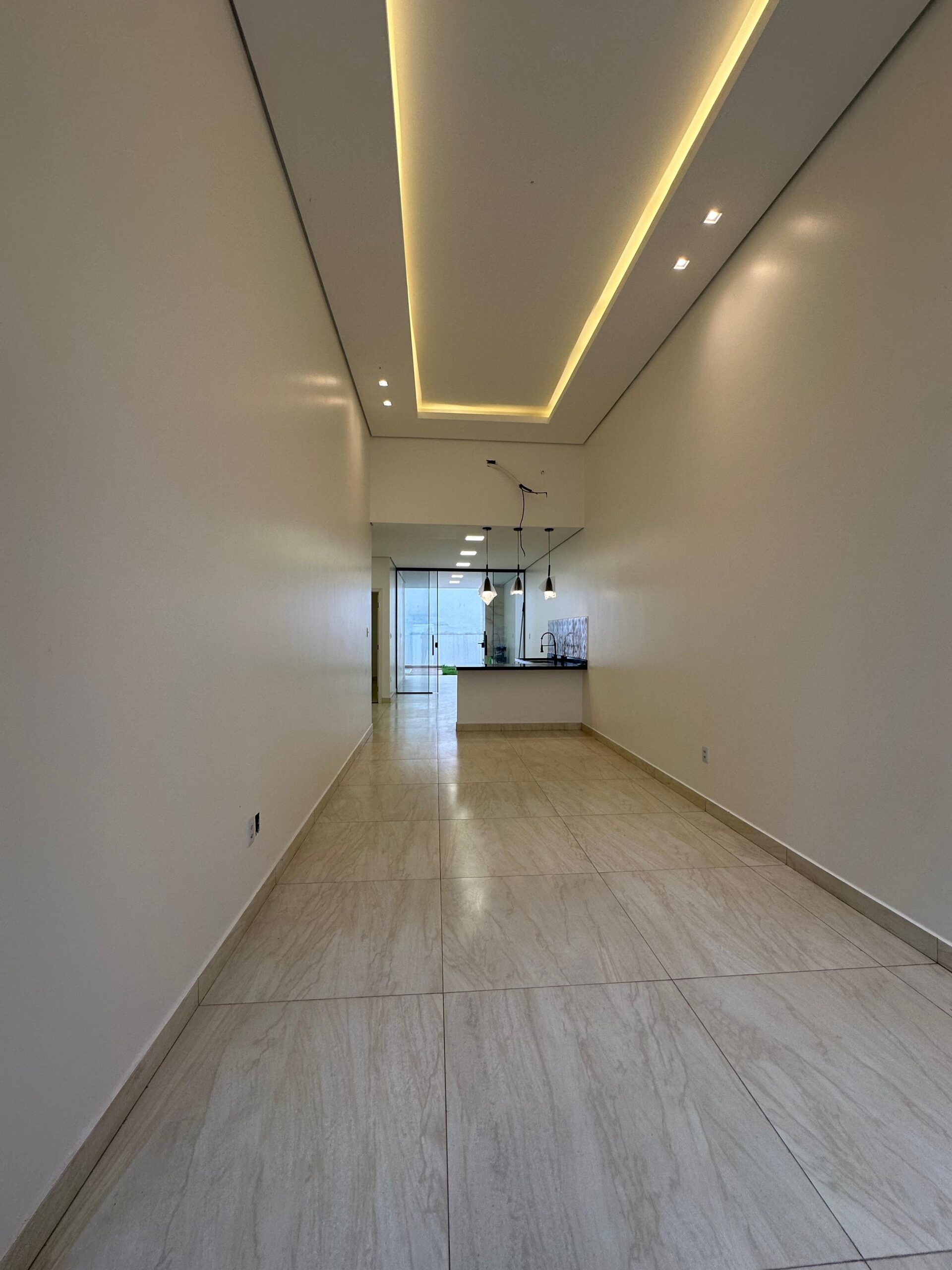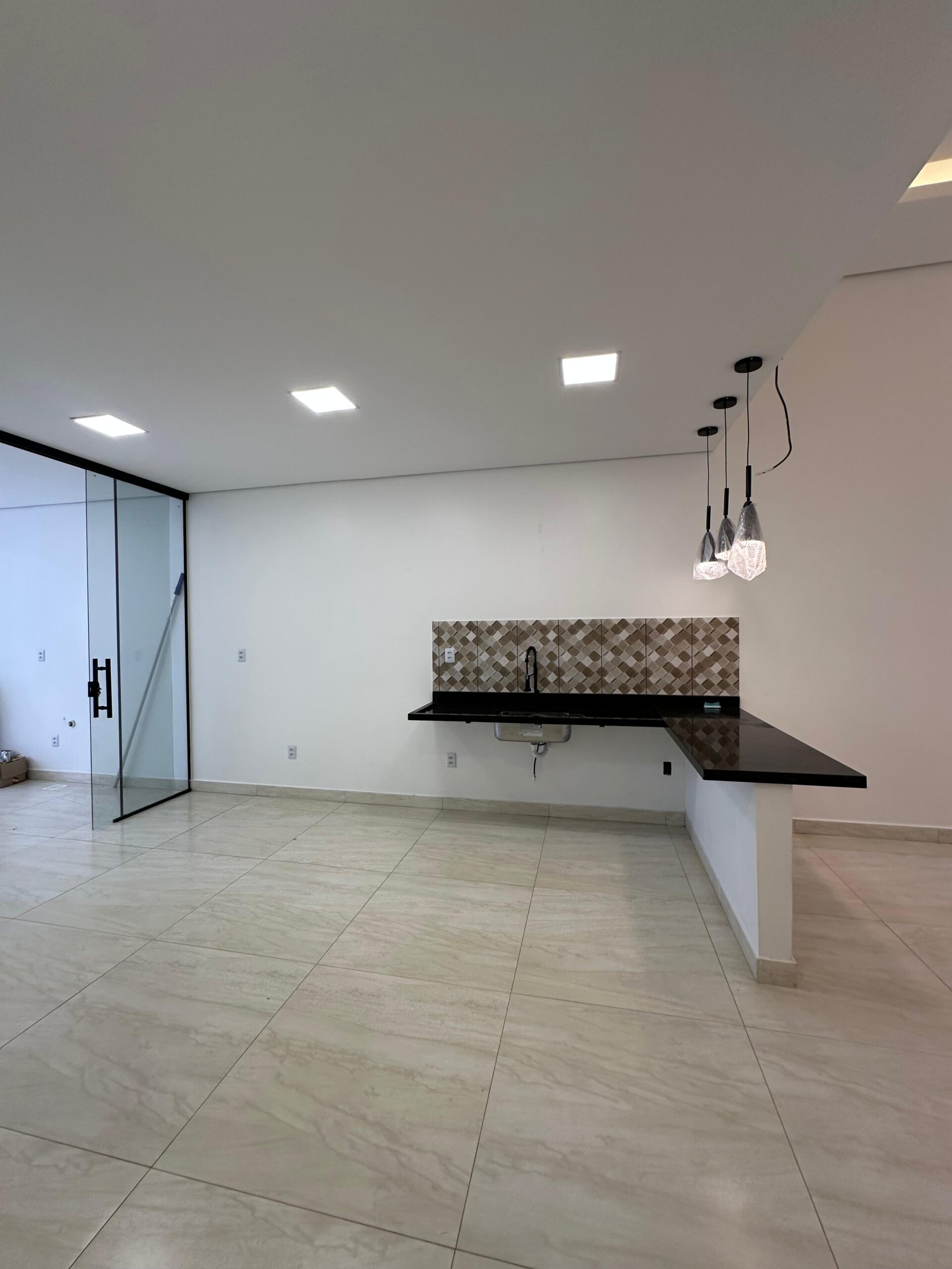 Sala de estar, jantar e cozinha integradas.